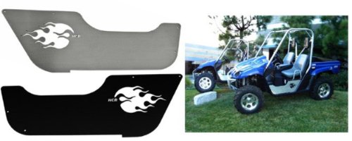 Yamaha Rhino 450 / 660 / 700 Side Door Flame Inserts - Aluminum by HCR. Black or Silver. RHI-01080F?Side Door Flame Inserts - Aluminum. These are our flame door insert plates. They are avaliable in natural silver and powder coat black. This kit comes with a right and left panel and all the hardware that you will need to mount them. You will have to drill two 1/4" holes on each side for mounting on the front stock deflectors the rear mounts will use the seat holes. This is a great alternative to half doors at 5 times the price. They are .125 thick material all edges deburred much better strength durability and better looks. It is made from 5052 aluminum sheet. We manufacturer all parts in our facility in the USA. Designed specifically for the Yamaha Rhino so they fit perfectly.
